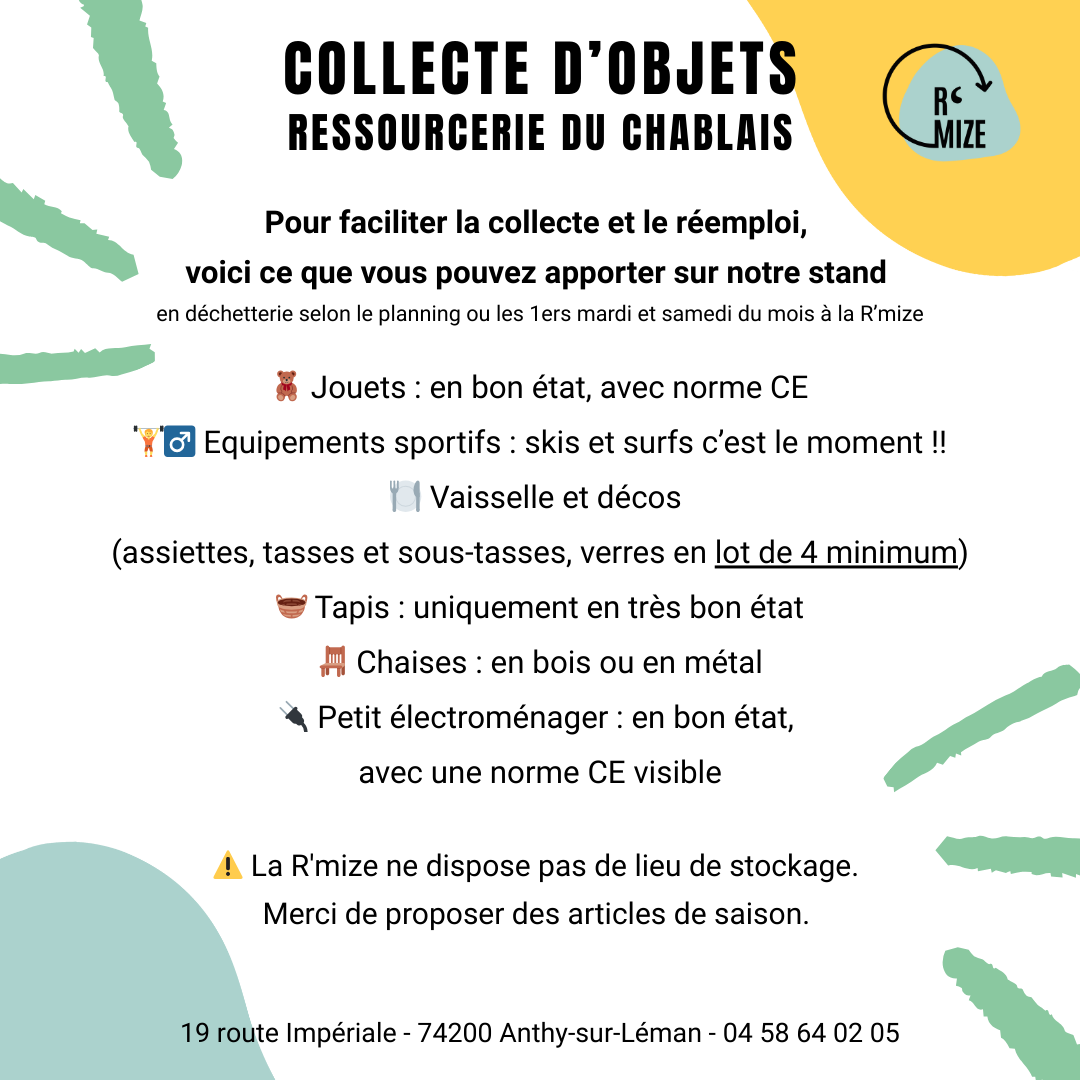 - Douvaine : vendredi 9h30-11h45/ 14h-16h30 et mardi 9h30-11h45. Une benne "orange" est également à disposition tous les jours pour collecter vos dons pour la R'mize.